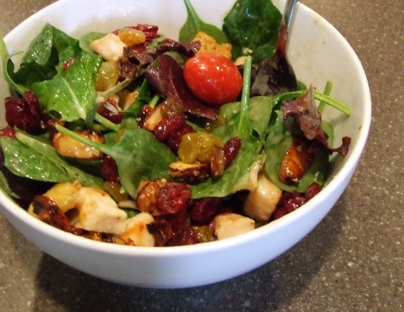 To make the almonds, pour some sliced almonds and some sugar into a small pan and turn the heat to medium. Stir the almonds constantly so they don't burn. The sugar will start to melt and stick to the almonds. Cook the almonds until they are roasted a nice light brown. Take the almonds off the heat and spread them out on wax paper or a paper plate until they cool.I looked for the right dressing for a while, and I think that the Honey Dijon dressing I found in the bagged salad section of Wal-mart is the best flavor for the salad. It's made by Marketplace.